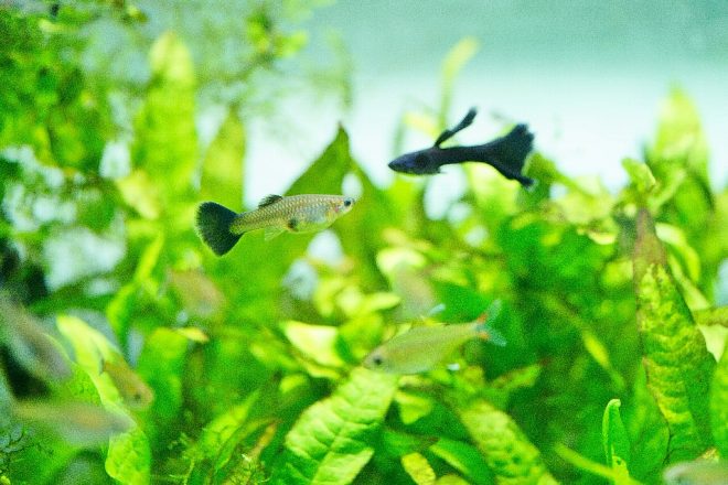 ちなみに、初心者向きのグッピーを教えてもらいました。1種類で楽しめるのはブルーグラス。交配の確率でブルー、レッド、そしてブラオと3種類が産まれる可能性があるため、バリエーションも楽しめるとのこと。ちなみにブルーグラスの場合、親魚が隠れ持った遺伝子が交配によって表面化し、ブルー以外にレッドやブラオという色合いになるそうです。このほか、水草水槽にはドイツイエロータキシードや真っ赤な体色のフルレッドもおすすめということでした。