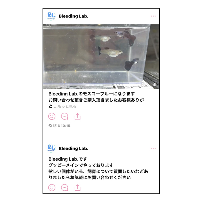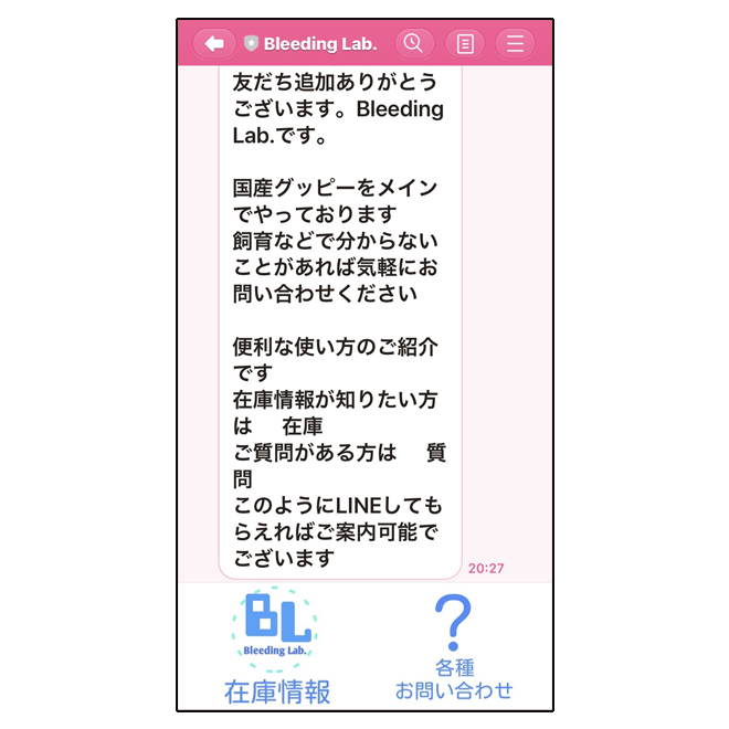 Bleeding Lab.はLINE上のショップです。まずは、ショップ名を検索して公式アカウントを友だち登録することから始まります。もちろん、QRコードを読み取るだけでもOK。「友だち登録はしたものの、どんなグッピーを買うかまだ決まっていない」という人でも大丈夫。グッピーの名前を知らなくても、どんな色がいいか決めかねていても、上垣さんにイメージを伝えるだけでちゃんと相談に乗ってくださいます。これなら初めて通販でグッピーを買う人でも安心して利用できます。