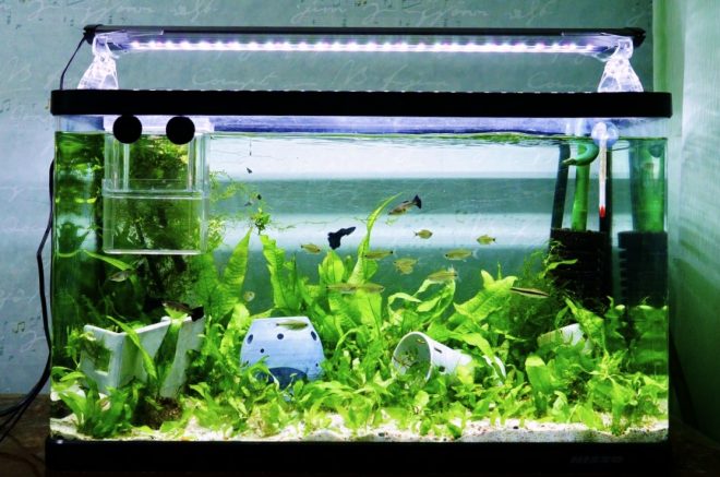 実際に立ち上がっている水槽は60㎝一本のみ。現在はこの水槽にモスコーブルーのオス2匹とメス3匹。気づかないうちにそれぞれのメスが初産で産んだ稚魚がどんどん大きくなり、産卵箱の稚魚にはアルビノが混ざっていることがわかるというラッキーハプニングも。言い忘れていましたが、グッピー飼育スタートを記念して、KOTOBUKIのLED照明「レイマックス」を購入。24時間自動調光システムが売りのレイマックス、単なる照明演出のためだけではない自然な生態系保持に寄与してくれています。