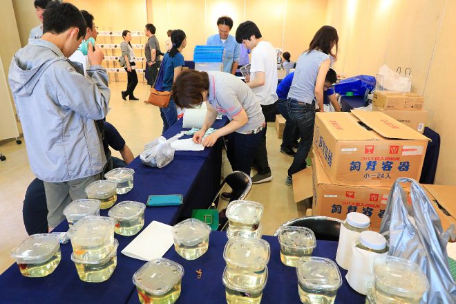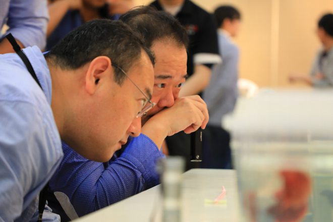 コンテスト初日の6月2日は、出品者の受付と第一次審査日。おなじみの会場となった大阪国際交流センターでは、運営スタッフはもとよりIBC(国際ベタ連盟)の審査員も各国から集合。着々と準備が進められていました。