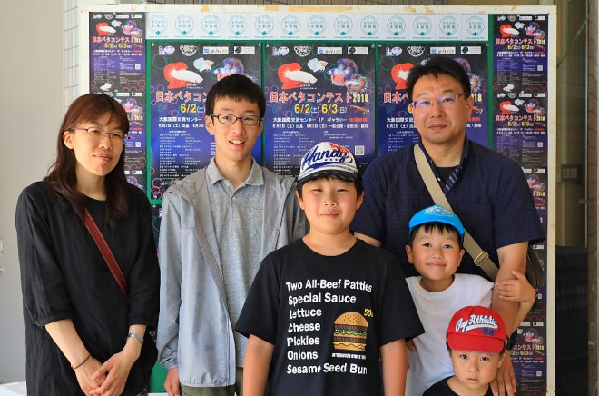 ベタコン事始め第1号登場(笑)。愛媛県から家族6人で来阪の樋口康裕さんご一家。ご主人はコンテストの常連ですが、今回は次男の綾斗君が初出品。まだ小学6年生。しかも出品するのは、てっきり色鮮やかなショーベタかと思いきや、意外にもワイルドベタ。ジュニアにしてはちょっとシブすぎでしょ(笑)。自分の部屋で大切に飼っている綾斗君のワイルドベタ。色が出てきた、とうれしそうにお父さんに報告してくれたそうです。