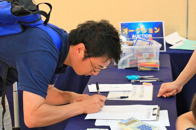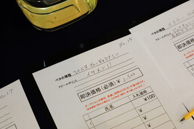 オークション会場では、出品者が自慢のベタの特徴をあの手この手でPR。「コンテスト出品者が出品しているオークションですからね。質の悪いベタがあるはずがありません」と、初来場してベタに値段をつける入札者がいれば、「毎日一生懸命育ててきたベタなので、ぜひ落札して欲しいです」と自信たっぷりの初出品者がいるなど、まさに需要と供給のバランスも完全一致。いいベタを安く買えるベタコンテストでのオークション、年々注目が集まっているような気がします。