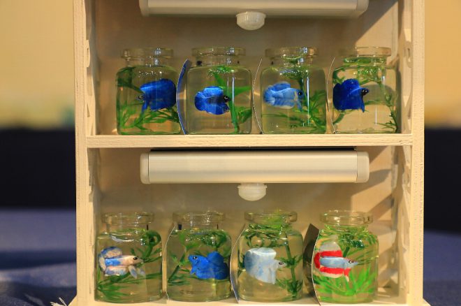 これは一体?誰の仕業ですか~、こんな場所にオタクみたいなものを置いたのは(笑)。よくみると、ややディフォルメされた女の子フィギュアとともに、ベタをテーマとしたミニチュア水槽がズラリ。ディティールもしっかりつくり込まれていて、まるで町中のベタショップのようです。