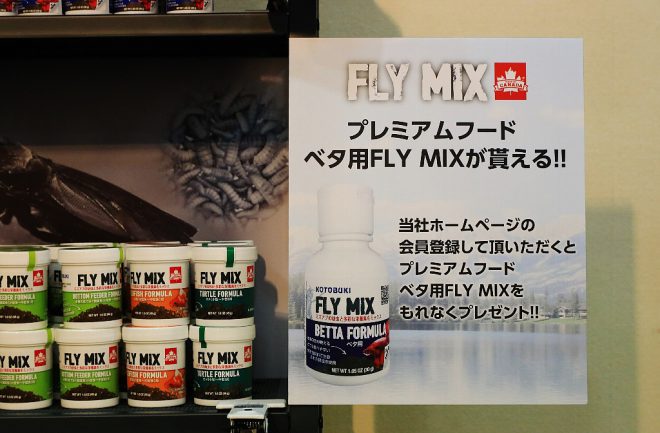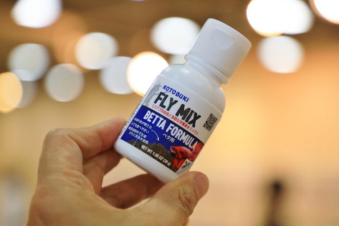 KOTOBUKI初のフィッシュフード。主成分にアメリカミズアブの幼虫を使った、国内では初お目見えのプレミアムフード。そしてベタコンテストにお目見えするのも初と、まさに初づくしのフライミックス。PRキャンペーンが、どうかうまくいきますように。