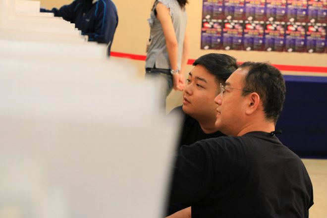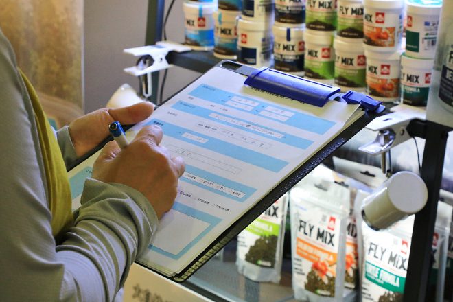 午前11時に出品者の受付が始まりました。単なる受付ではありません。出品するベタがどのクラスなのか、何匹出品されるのかなど、間違いのないようチェックが結構大変です。