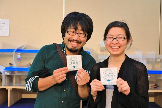 仲良くカップルでやってきた川地敦詞さんも、初めのご来場。気軽にタメグチでしゃべっていたら、岐阜県のアクアショップ・Aqua Studio NATUREのスタッフと知り、こりゃ失敬(笑)。「地元ではあまりいいベタがないんですよ~。噂には聞いていましたが、ここはさすがですね」と絶賛見学中。