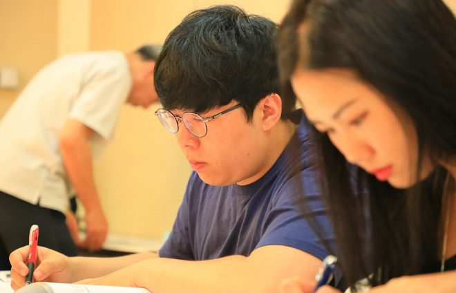 すべての講習が終わって、最終試験に臨む韓国の見習い審査員のリーさんたち。韓国で初めての公認審査員の誕生が待たれます。