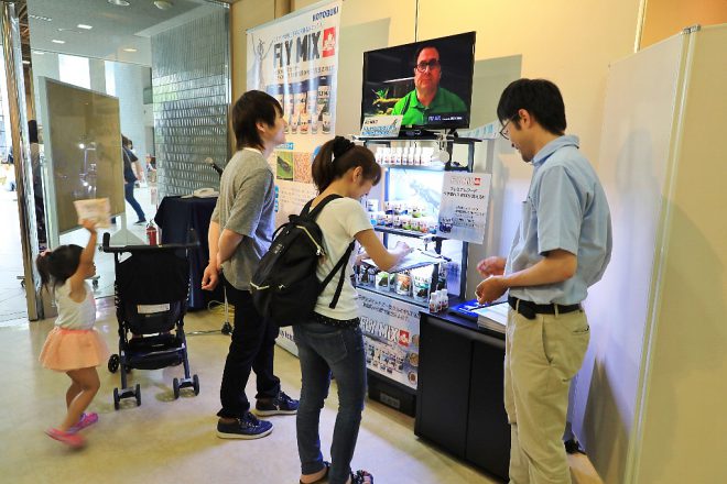 特設ブース前では、KOTOBUKIのスタッフによりパンフレットやビデオなどのツールを使って、来場者にフライミックスをPR。