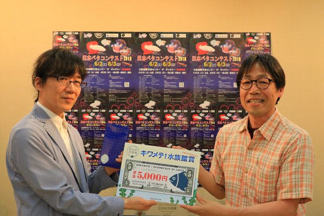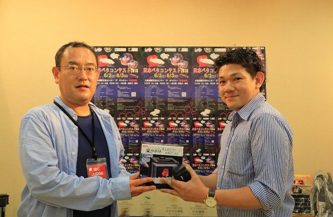 今回ハーフムーンなど2匹を初めて出品した明石市の福躍泰宏さん。しかも協賛賞を初受賞し、「来年こそは上位入賞を必ず」と誓ってくれたイケメンです。普通のサラリーマンかと思いきや、実はベタだけでなく色々なアクアをテーマに動画配信しているユーチューバーなんです。チャンネル登録者数も5,000近くも。アクセスも多いし、さぞかし儲かってるでしょ?「いやぁ~、まあまあですかね~」。ウソつき~っ(笑)!