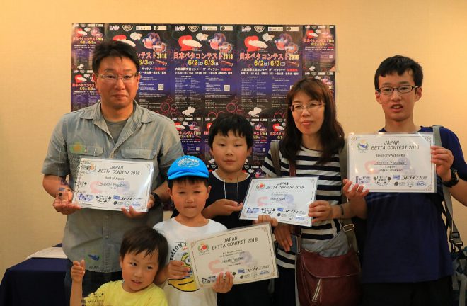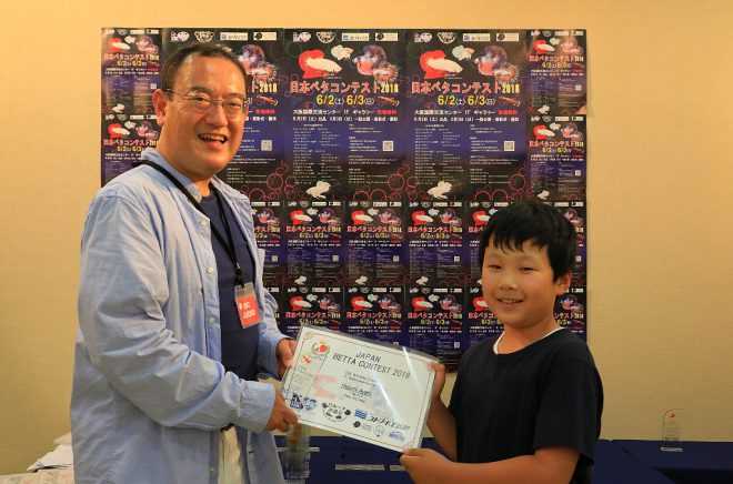 そして、ワイルドベタ部門・泡巣タイプ小型種クラス部門賞3位入賞で名前を呼ばれたのは。。おお~、家族6人で愛媛から来阪した樋口綾斗君ではありませんか!初出品で初入賞、おそらくベタコンテスト始まって以来の最年少記録!おめでとう!なんせワイルドベタ部門ですからね、極めて難易度の高い部門にもかかわらず実にお見事でした。感想を聞くと、「はい、めっちゃうれしいです」とちょっと興奮気味なところがまた小学生らしくてイイ(笑)!
