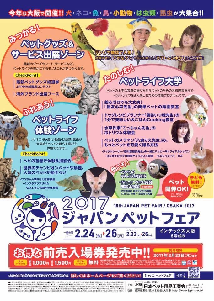 「ジャパンペットフェア2017」一般来場は、 2月24日(金)~26日(日)、 インテックス大阪6号館(大阪市住之江区)で間もなく開催。みなさんのお越しを心よりお待ちしております!