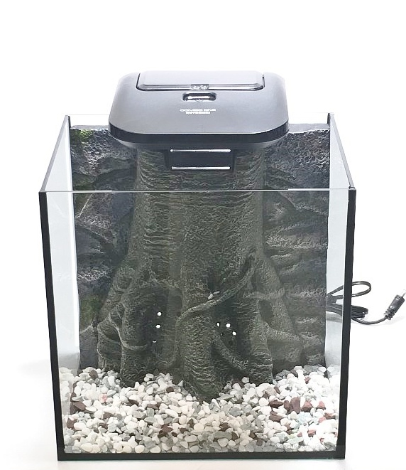下の写真。アクアコンボワンタッチディスプレイと命名されたディスプレイ用品。わかります〜?そう、アクアコンボにピッタリフィットする本格ディスプレイグッズの写真なんです。アクアコンボは、コンパクトで簡単にアクアリウムを始めることができるアイテムですが、その一方、本格的なレイアウトは初めてというユーザーには未知の世界。そこでワンタッチでイケてるレイアウトを完成させてしまうのがこのアイテムなんです。これなら簡単にアクアリウム完成!