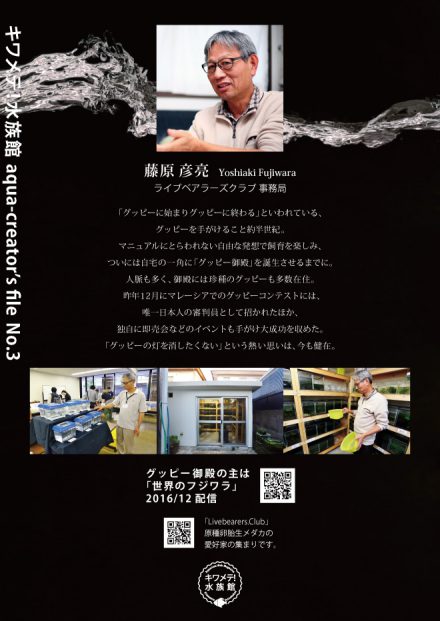 そして最後。アクアクリエイターズファイルvol.3。去年、関西で初めてメダカやグッピーなどのブリーダーさんが中心となった展示即売会「アクアブリーダーズフェスタ」のリーダー的存在が藤原彦亮さん(ライブベアラーズクラブ事務局)。あくまで趣味として長年ライブベアラーズ系を飼育してこられ、ご自宅取材時に対面した「グッピー御殿」には度肝を抜かれました。従来の飼育方法に縛られない自由なやり方に感銘し、今回生体の出品をお願いしました。