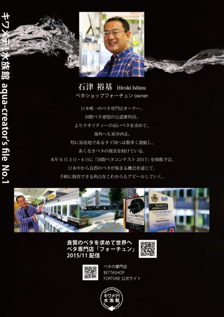 まずは、アクアクリエイターズファイルvol.1。日本唯一のベタ専門ショップ・フォーチュン店長の石津裕基さん。ベタのスペシャリストといえば、もうこの人しかありません。2年前に取材し、去年は「国際ベタコンテスト2016」でも色々お世話になりました。