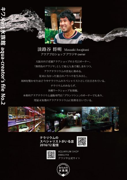 続いてこちら。アクアクリエイターズファイルvol.2。大阪市西区にあるショップ・アワジヤの店長・淡路谷将明さん。以前ショップの取材をさせていただいた際に、アクアテラリウムのスペシャリストであることを知りギョギョッ(笑)。その手腕に惚れ込んで、今回は3つの作品をつくっていただきました。