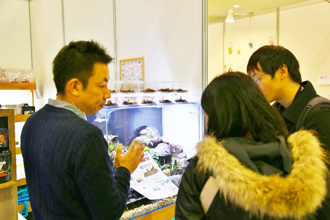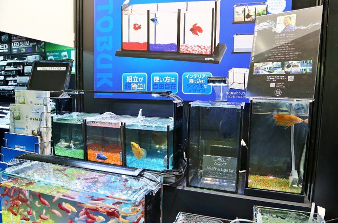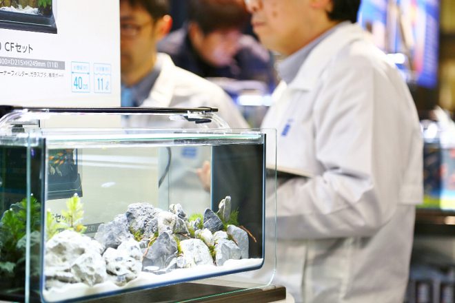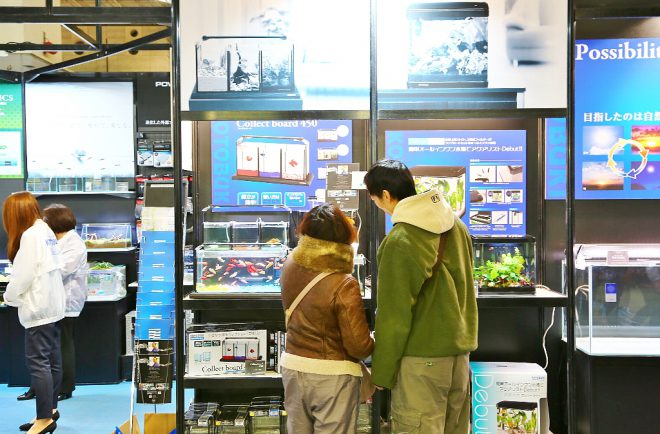 一番高い位置に置かれていたのが、15㎝のキューブ水槽が3本ぴったり収まる新製品「コレクトボード450」(発売中)。水槽と水槽の間にある仕切りを出し入れして、フレアリングを楽しむ人の姿もありました。