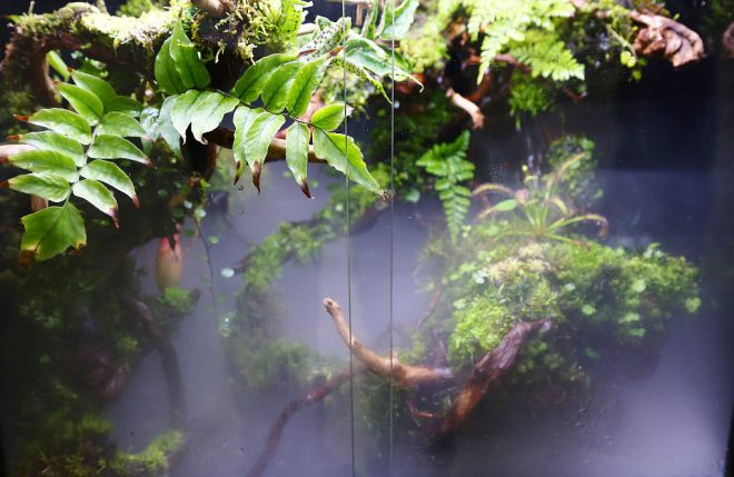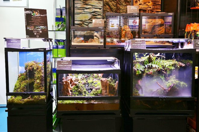 アクアテラリウム製作に際して、参考出展の爬虫類専用ケース「ヒュドラ」を使ってもらいました。ガラス扉を備え、しかも上部のメッシュ部分も取り外せることから、爬虫類飼育だけでなくテラリウム育成にも適していることがおわかりいただけたかと思います。