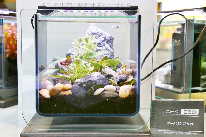 「お、これカッコいいやん!」。そんな声が多く聞かれたのが、スタイリッシュ水槽「アーク」。ショップ関係者・一般ユーザーに関係なく人気がありました。先日の「キワメテ!水族館」でも少しだけ触れましたが、まさに「社長室にありそうなイケてる水槽」。