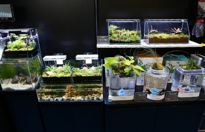 水槽というより、インテリア什器のようで、とてもカッコいいアイテム。これが淡水魚の飼育と植物の育成を同時に楽しめる自然循環システム「アクアポニックス」だったんですね。展示ブースでは、ほぼこれがメインでめっちゃ目立ってました。