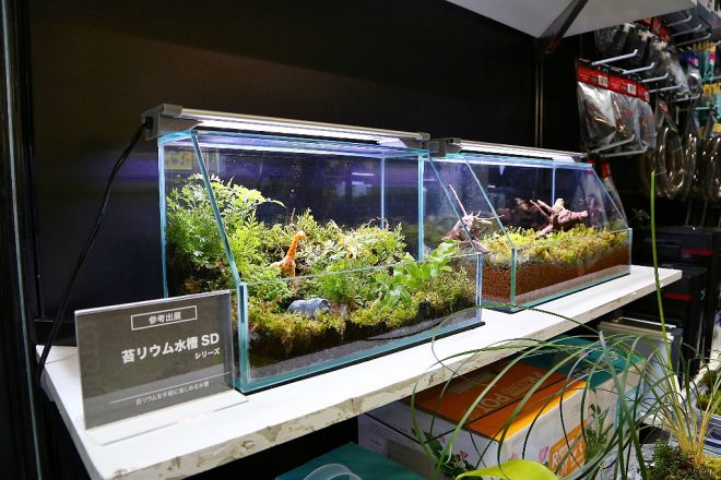 3年前に登場した自然循環型シテスム水槽「アクア ポニックス」などと並んで、植物飼育を前提としたコケリウムのための専用水槽が参考出展。気軽にコケリウムやテラリウムが始められそうな手軽な水槽で、とっても気になる商品でした。