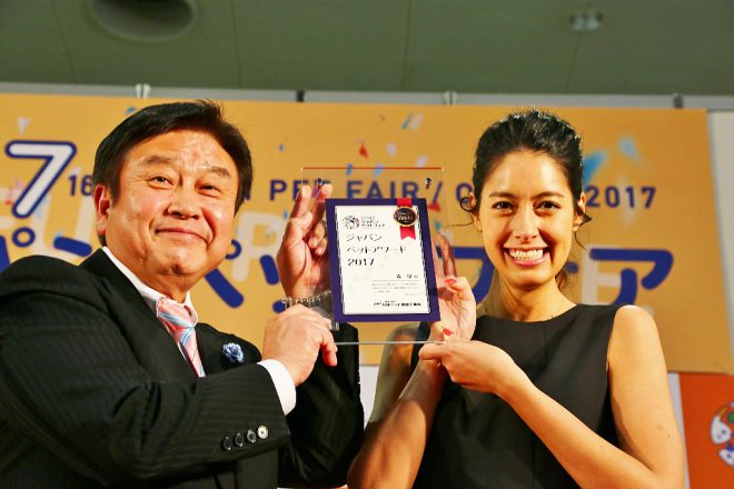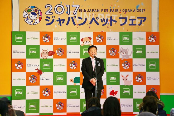 少しさかのぼって、23日(木)のビジネスデーでは「2017ジャパンペットアワード授賞式」がイベントステージで行われました。あいさつするのはペット用品工業会・柳原会長。これまでペットのためにさまざまな活動や功績を残し、ペット業発展のために寄与してきた人々を表彰する制度です。