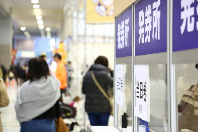 会場となったのは、大阪市住之江区の南港インテックス大阪6号館B。春の到来にはまだ少し早いせいか、朝晩は少し冷え込む3日間でした。それでも早くからチケットを求める人が数多く会場に到着。今か今かとオープンを待っていました。