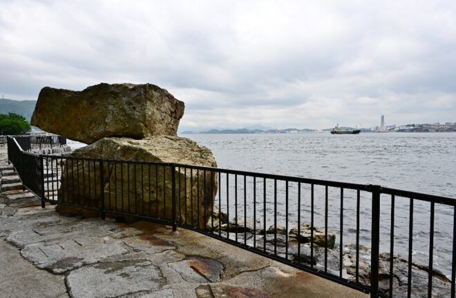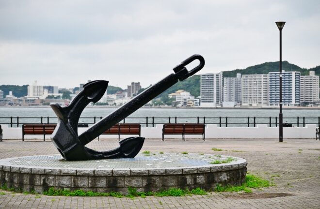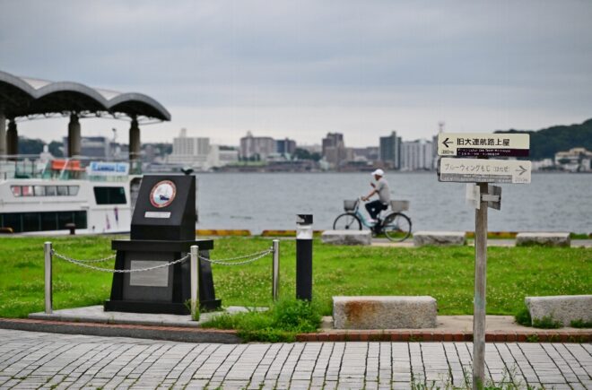 駅から少し東に歩くと、サイクリングロード「しおかぜの路」へ。目の前に見えるのはもちろん関門海峡。近くには門司港出征の碑があり、かつてはここから大陸へ兵士が送られた往時を忍ばせています。
