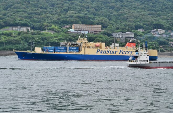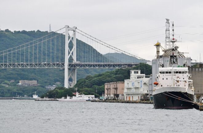 海峡とは思えない距離感。向かい側は山口県下関市。近年マンションなども建ち並び、風景は少しずつ様変わりしています。