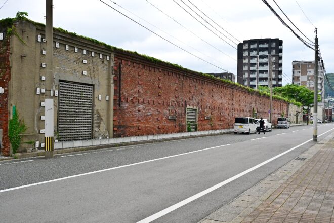 かつてレンガ倉庫だった壁面がそのまま残されている駐車場も。