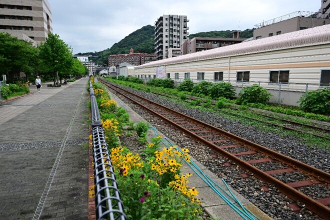 歩いていると、線路に出くわしました。観光トロッコ列車「潮風号」の走るルートでした。潮風号は土日のみの運行で、この先和布刈(めかり)エリアまで約10分で結んでいます。