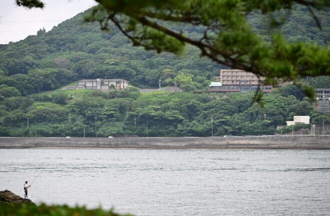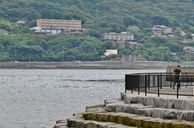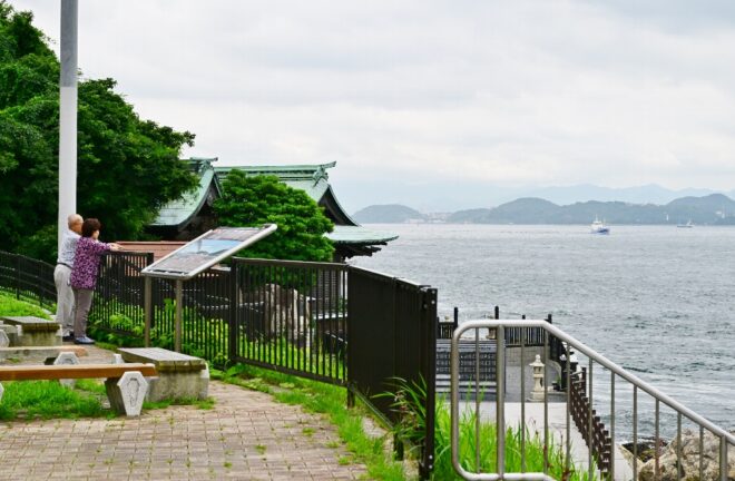 すぐ近くの和布刈神社付近から、関門海峡を見渡す人たち。関門海峡が船にとって難所といわれるのはなぜなのでしょうか。