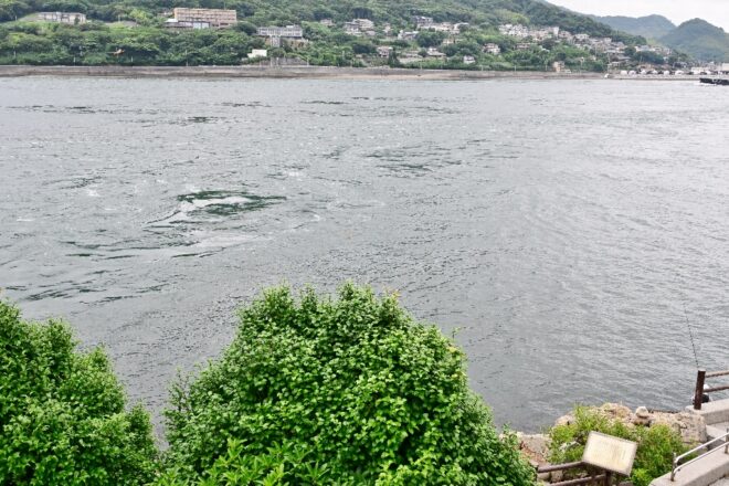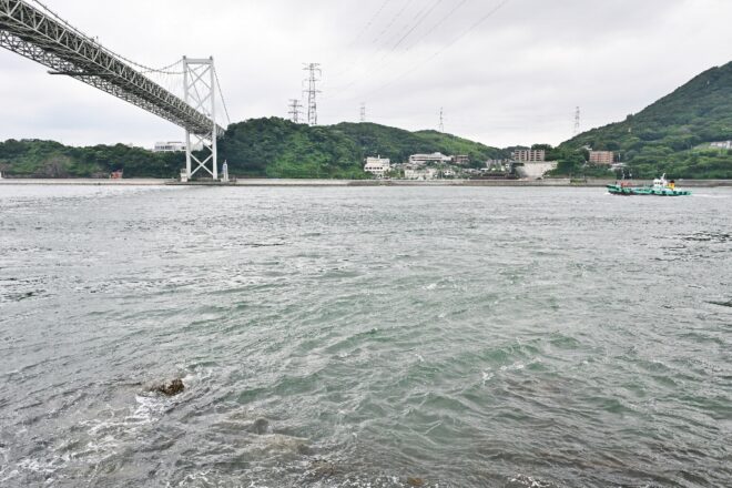 間近に見る潮流。海面が力強く渦を巻いていて、潮流の速さを物語っています。
