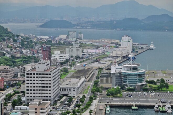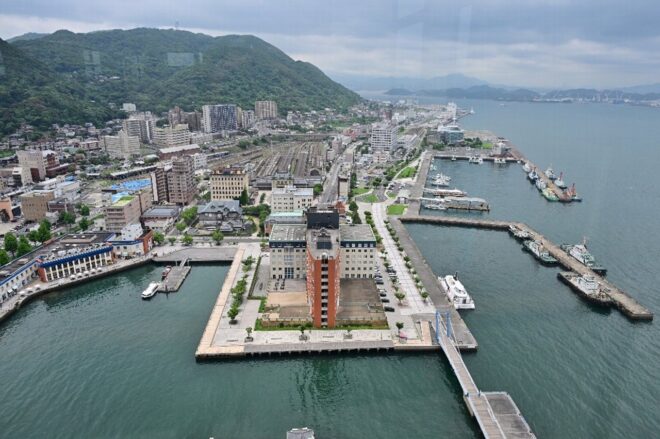 高さ103mの門司港レトロ展望室から見た門司港周辺。中央が門司港駅。