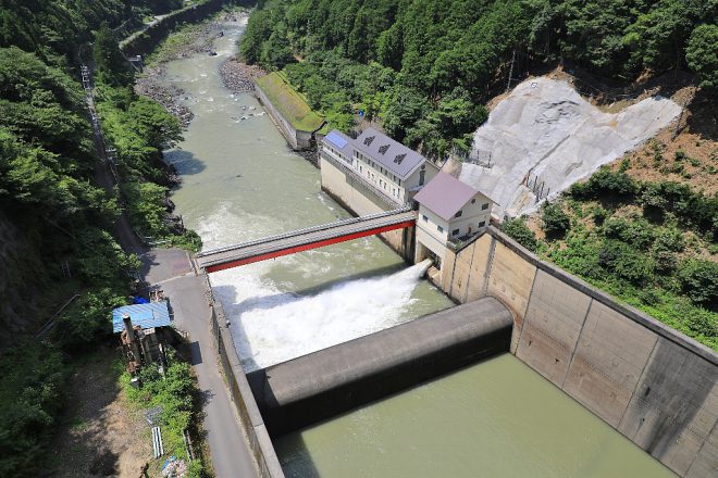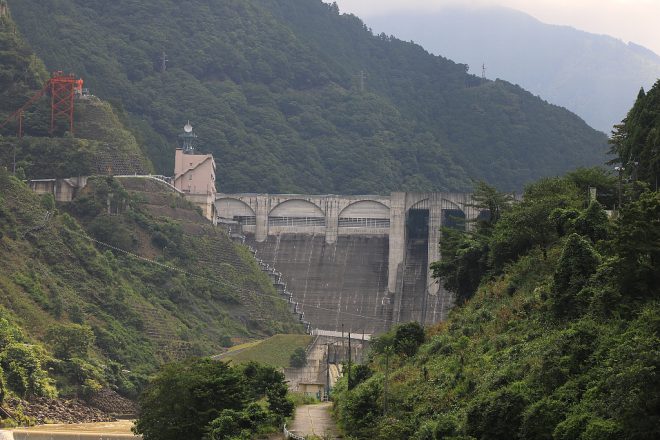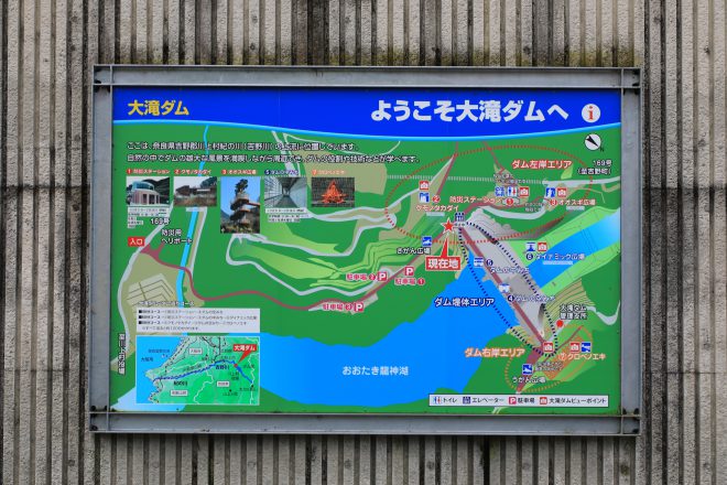 目の前には大滝ダムの姿が。竣工は2012年と比較的新しく、近代技術の粋を集めてつくられました。村の治水や利水、そして発電設備としての役割も担っている、頼もしい存在です。