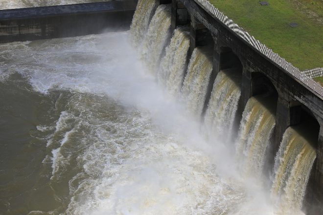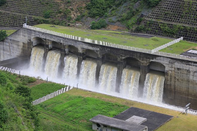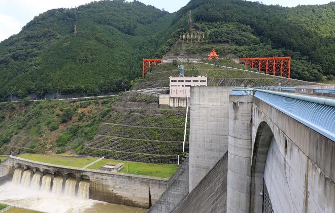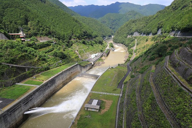 大迫ダムでも放流の真っ最中。ひとつの村に2つもダムがあることで、集中豪雨など吉野川の自然災害に長年苦しんできた村の不安もなくなりました。