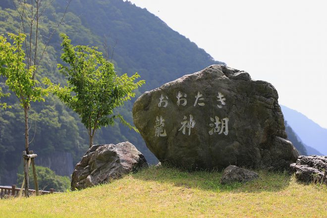 ダムの反対側にはダム湖「おおたき龍神湖」が広がります。あいにくの大雨の影響で、水の色は全然アウトでした(笑)。台風一過、お天気にだけは恵まれましたが。