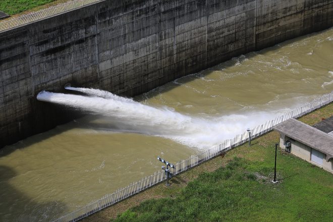 ゴウゴウという水のほとばしる音が聞こえてきました。台風の影響からか、ダムの放流が始まっていました。