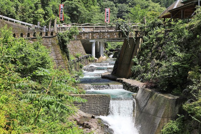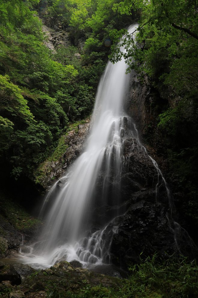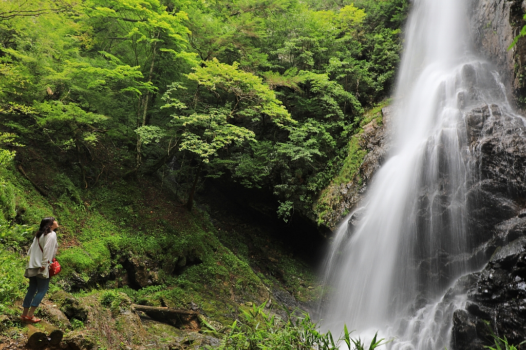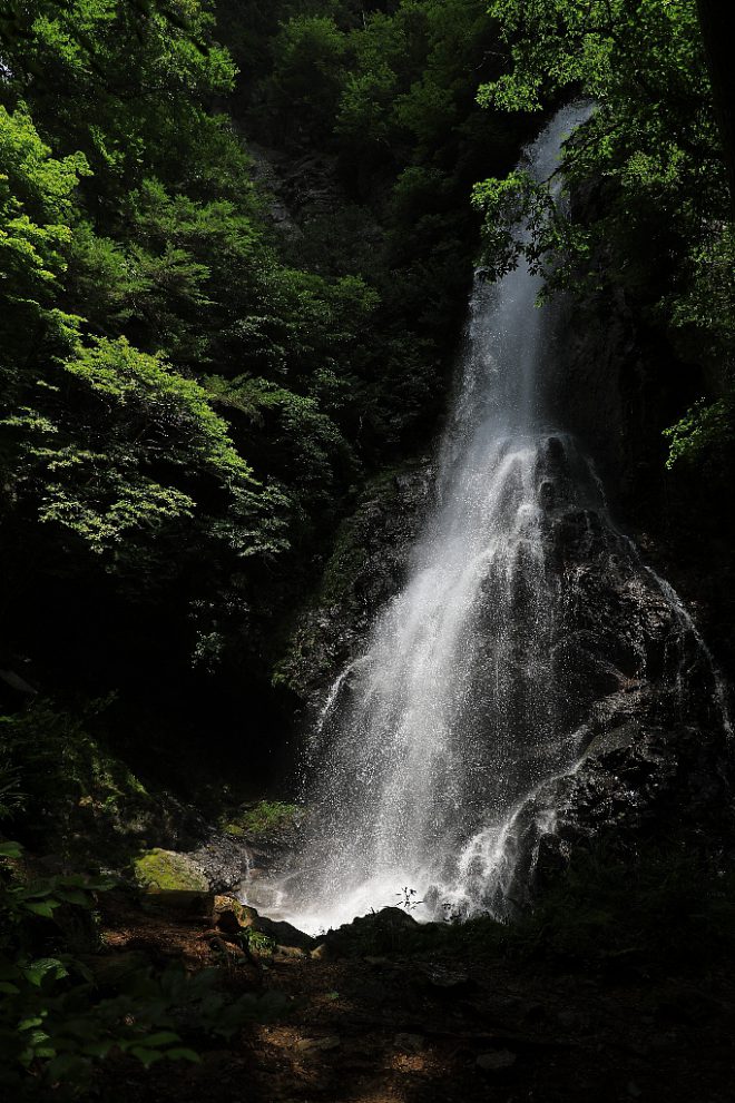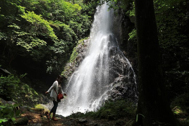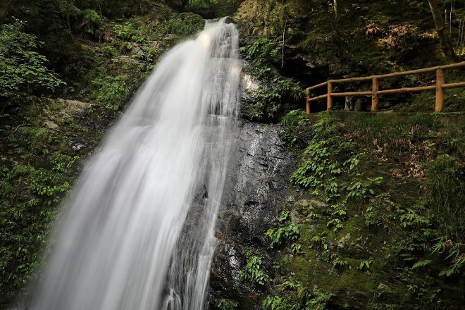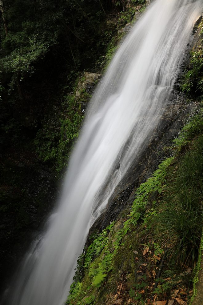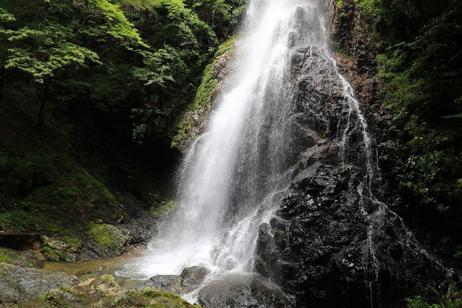 高さ約50m。万葉集にも登場する滝として知られ、奈良県指定の「やまとの水」のひとつとして選ばれています。周囲のほとんどが木陰のため、清涼感もたっぷり。ほとばしる飛沫をいつまでも見ていたい気分です。