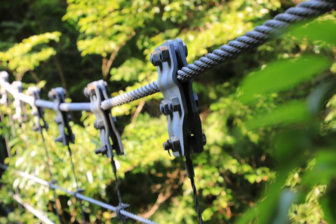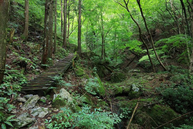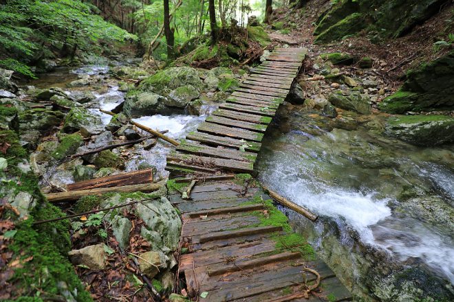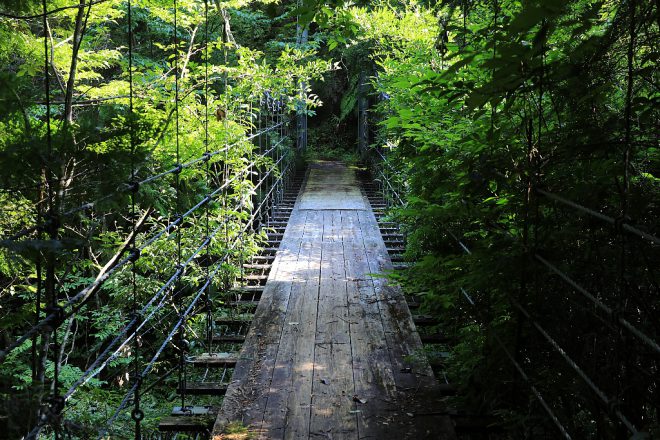 スリル満点の木橋。とはいえ、ヒールでさえなければ女性でも注意しながら歩けます。