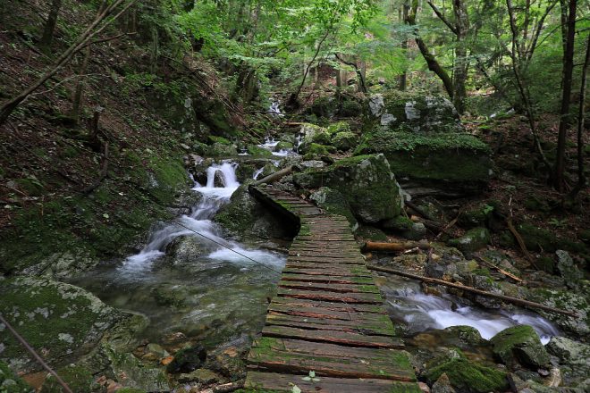 滝までのアクセスは、この手作りらしき木製の橋だけが頼りです。突然山深い秘境にワープしたような、野趣あふれるシーンです。