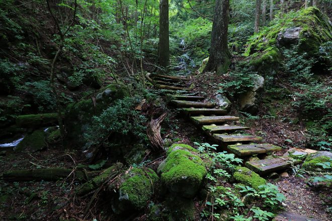 石段を上って少し森へ分け入ると。。。お~、このヒンヤリ感はヤバすぎます(笑)。今さっき車を下りてきたばかりなのに、明らかに5度以上は間違いなく涼しいです。