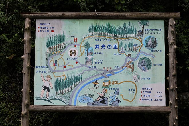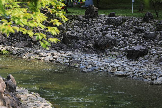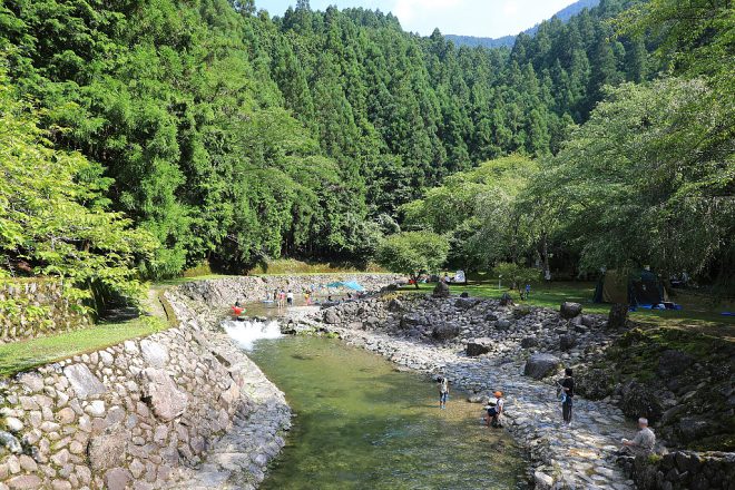途中、水が段々になって流れていた「井氷鹿(いびか)の里」。キャンプやバーベキューなどのほか、あまご釣りも体験できるアウトドアスポットです。残念ながら、こちらも水曜日がお休みでした(笑)