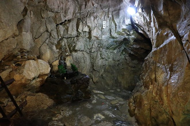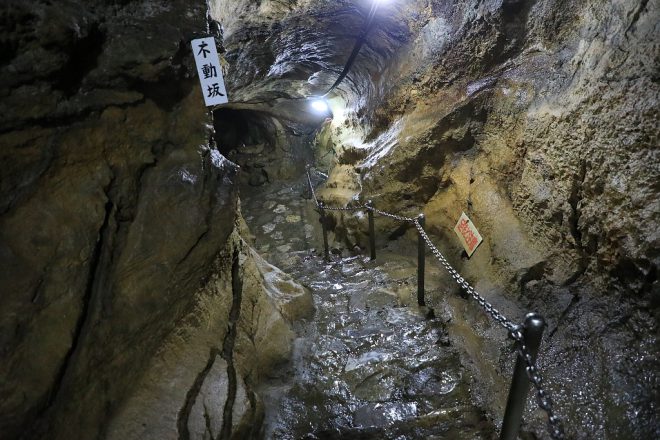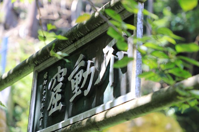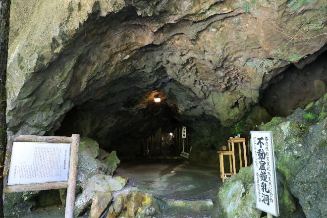 気になるスポットがもうひとつ。定休日を心配してやってきたのですが、幸いここは大丈夫でした(笑)。「不動窟鍾乳洞」。1300年前に修験道の行者によって発見されたという鍾乳洞で、その名の通り不動尊が祀られています。