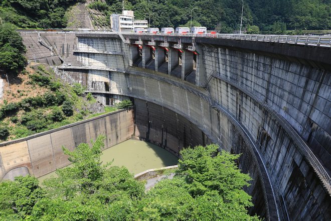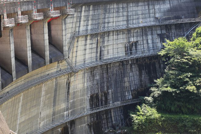 景観まで意識してつくられたという大滝ダム。水の排水口もそれぞれがアーチ状になっていて、まるで要塞のような。写真でしかお伝えできないのが残念ですが、その迫力たるやなかなかすごいです。