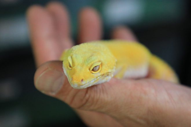 取材の日の朝、生まれたばかりという赤ちゃん。そばにはまだ卵のかけらが残っています。「やっぱりこの瞬間が一番感動しますね。レオパを飼っているのは、このためだといっても過言ではありません」。