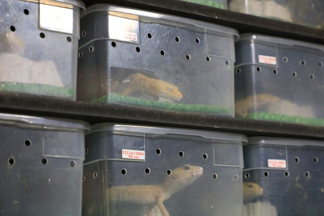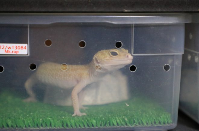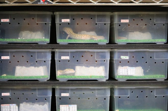 ケースは、繁殖用のアダルトと生後間もないベビーに大別。取材中、声を聞きつけたのか大人のレオパが興味深そうにカリカリやってるのが印象的でした。