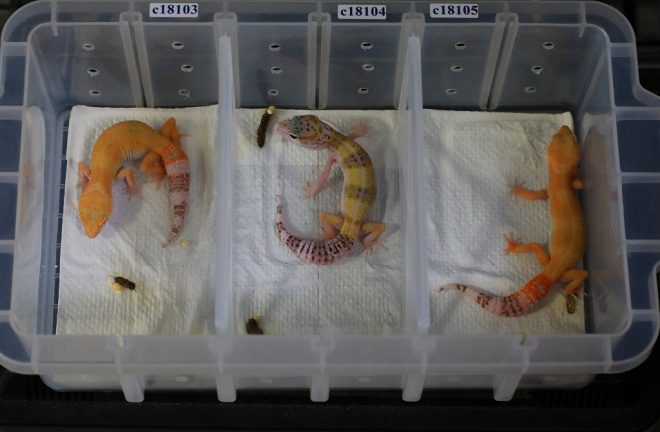 一方、別の部屋にいるのは、もうすぐ孵化する予定の卵たち。「単にブリーディングだけでなく、最近は遺伝子の勉強もしていて役立てています」と岩見さん。そうなんです、繁殖はできても遺伝子のことがちゃんと理解できていないと、無理な掛け合わせによって不都合が生じるのは、魚だけではないんです。レオパの遺伝子の研究までする人はなかなかいないからと、ペットショップからもガチで問い合わせが少なくないそうです。