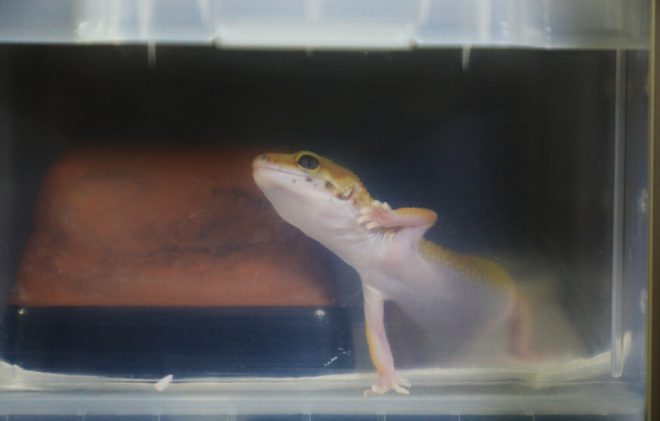 室温は28度に設定。温度管理も重要なファクター。「確かにほかの爬虫類と比べると飼育は一番簡単ですが、変温動物なのでヒーターも必要不可欠です」。ですよね~、自分で体を温めたり冷やしたりできないんですから。