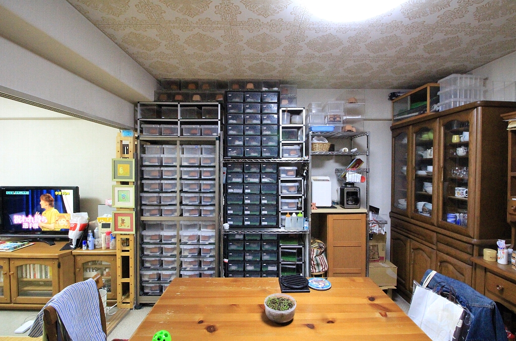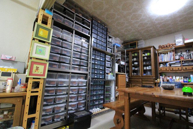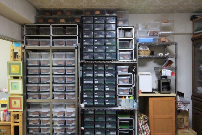 LDKにテーブルがあるということは、ここでご家族みなさん食事も?「はい。みんなで普通に食事してますよ(笑)」と何事もないように笑顔で語るのは、12年前からレオパのブリーディングにとりつかれた男・岩見一雄さん。今も現役サラリーマンではありますが、「あまりにもレオパが可愛すぎて」趣味として飼育を始めていたら、「いつのまにかこんなことになってしまいました(笑)」。