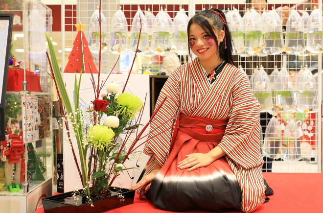 ん?キミはいったい誰(笑)?顔に金魚のペイントを施し、袴の帯飾りには金魚が。鹿鳴館時代の麗しき女性を思わせる彼女。大学では池坊華道に属しつつ、好きな金魚の文化や歴史を調べることが趣味なのだそう。ウケ狙いでの演出かと思いきや、マジメにちゃんとやってる女子大生でした(笑)。